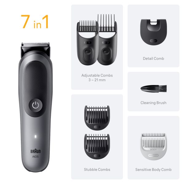 Braun's versatile All-in-One Grooming Kit for men. The 7in1 Tool Kit lets you effortlessly trim your beard, ears, nose, clip your hair and manscape your whole body. Comfortably achieve precision and efficiency with the Ultra Sharp Blade. Safely and perfectly body groom with SensitiveTrim technology. 14 length settings and AquaGrip for underwater use give you full grooming control. Braun AIO Series 5 is built to last, waterproof and with up to 120-min runtime Li-Ion battery.Box content: 1 trimmer, 6 combs, 1 cleaning brush