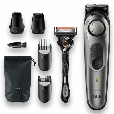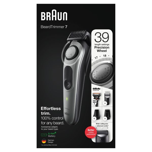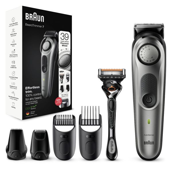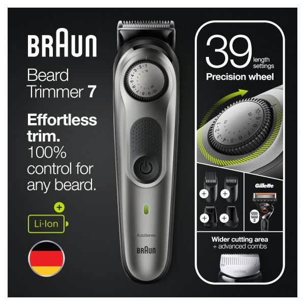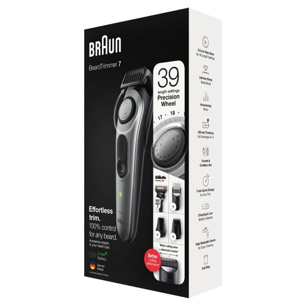 Achieve your style effortlessly with the Braun BT7 beard trimmer and hair clipper for men. This beard trimmer is sharper, faster and more efficient—with a wider cutting area to capture and cut more hair in every stroke*. Beard Trimmer 7 includes a precision dial with 39 length settings, lifetime sharp blades, and Li-Ion battery. With washable trimmer head and combs.
