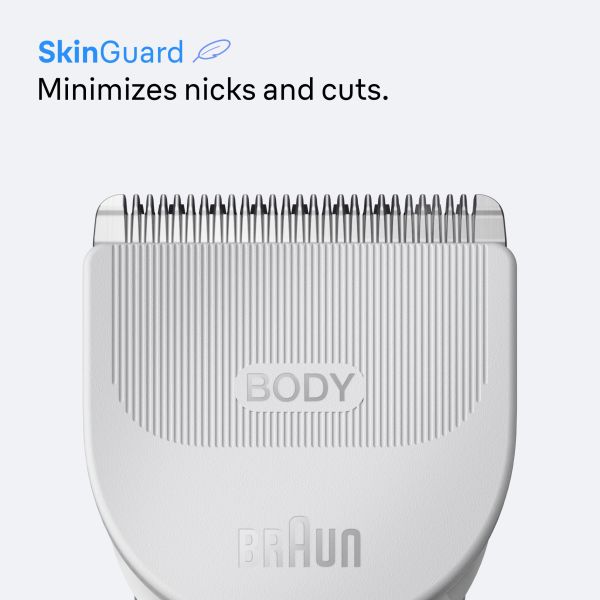 Braun's Body Groomer for men protects sensitive skin. This grooming tool features SkinGuard technology to minimize nicks and cuts, letting you groom and trim anywhere. The Body Groomer comes with a detachable Sensitive Comb to ensure a safe and comfortable experience by preventing skin contact with the blade. Body Groomer Series 3 in light grey, built to last, 100% waterproof and 80-min runtime battery.Box content: 1 body groomer, 1 comb, 1 cleansing brush