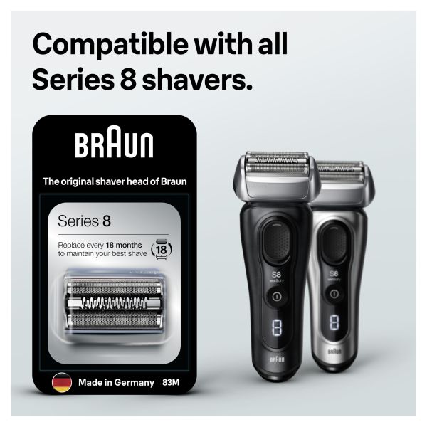 The average Braun shaver cuts 6 million hairs every 18 months. This means the head will gradually wear out and your shave can become less close and comfortable. That's why Braun recommends changing your shaver's foil & cutter block every 18 months to get your shaver back to its best. Take care of your shaver, and it will take care of you. Box includes: 1 X Series 8 Shaver Head Replacement, Silver