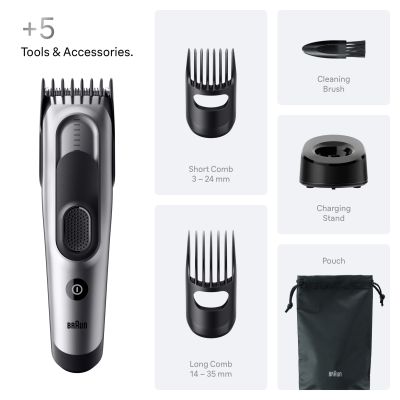 Easily achieve your hair style from home with the Braun Hair Clippers. The Lifetime Sharp Blades make hair trimming easy at any length or thickness. With 2 combs, 17 length settings and Memory Lock to secure your last setting. Has a powerful Ni-MH battery, 50-minute runtime and washable design. Makes a great gift for men.Box content: Braun hair clipper, 2 combs (3-24 mm, 14-35 mm), 1 charging stand, 1 pouch, 1 cleaning brush