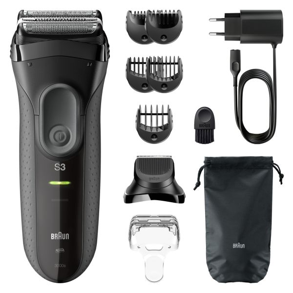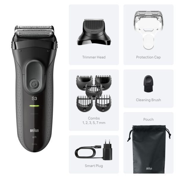 Braun Series 3+ electric shaver offers a close and comfortable shave. 2 foil shaving elements and 1 center trimmer to shave longer hairs. Flexible blades adapt to follow the contours of your face. Efficiency MicroComb, captures more hairs in one stroke (vs previous Braun Series 3, tested on 3-day beard). Beard Trimmer head attachment, to precisely contour sideburns or mustache. Thin shaving head, for an easy shave even in hard-to-reach areas. The Series 3+ electric razor for men is waterproof. Made in Germany. Box content: 1x Braun Series 3+ shaver, 1x protective cap, 1x charger, 1x cleaning brush, 1x Beard Trimmer Attachment, 5 combs