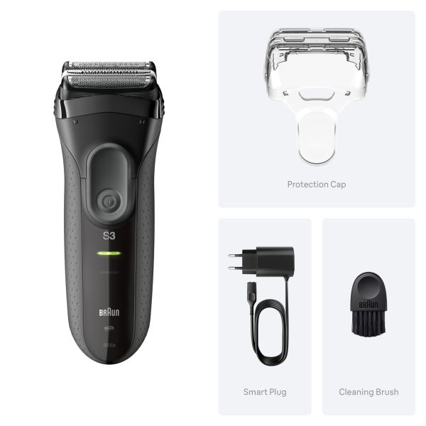 Braun Series 3+ electric shaver offers a close and comfortable shave. 2 foil shaving elements and 1 center trimmer to shave longer hairs. Flexible blades adapt to follow the contours of your face. Efficiency MicroComb, captures more hairs in one stroke (vs previous Braun Series 3, tested on 3-day beard). Thin shaving head, for an easy shave even in hard-to-reach areas. The Series 3+ electric razor for men is waterproof. Made in Germany. Box content: 1x Braun Series 3+ shaver, 1x protective cap, 1x charger, 1x cleaning brush