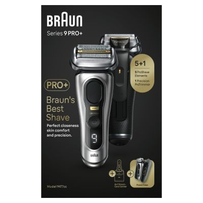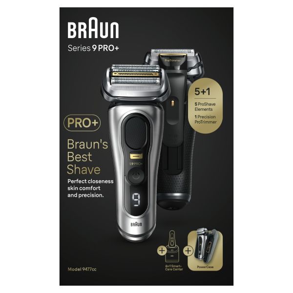 Get Braun Series 9 PRO+ electric razor, redefining shaving to deliver ultimate closeness & skin comfort. With 5 specialized ProShave elements including ProLift Blade, Series 9 PRO+ provides an efficient and gentle shave in every stroke, no matter 1, 3, or 7-day beard. Get ultimate precision thanks to the Precision ProTrimmer enhanced with surgical-grade stainless steel, perfectly cutting even the longest hairs, sideburns and moustache. 100% Made in Germany & built to last every day, for years with a powerful 60min li-ion battery runtime. Use wet or dry. With 2 premium everyday essentials: 6in1 SmartCare center for a shaver like new every day & PowerCase for up to 60min of mobile