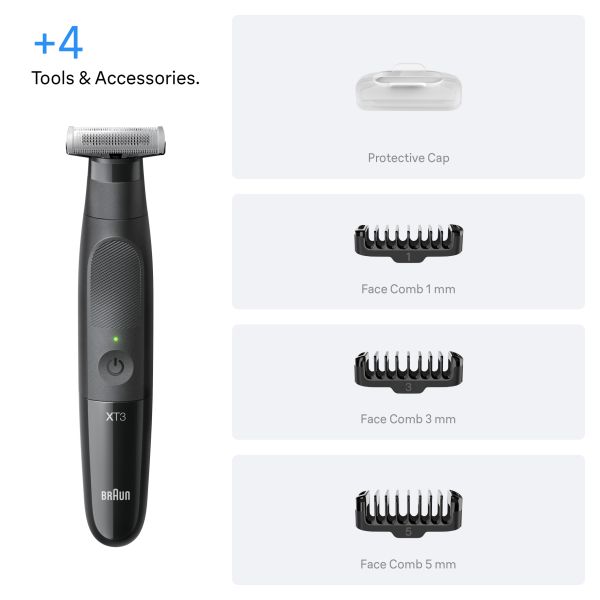 Groom in any direction with Braun Series X.Box Content:1x trimmer device 1x 4D-flex blade3x face combs (1 mm, 3 mm & 5 mm)1x protective cap
