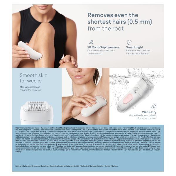 The Braun Silk-�pil 5 ensures up to 1 month of smooth skin, anytime. This Braun epilator is equipped with MicroGrip tweezer technology, capable of capturing hairs that wax can't (as short as 0.5mm). Experience less pain sensation thanks to the massage roller cap. Say goodbye to the inconvenience of waiting for hair to regrow with other hair removal products such as wax. This cordless epilator is designed for convenience and eliminates the need for clean-ups or appointments. Tip: for reduced pain sensation, epilate in the bath or shower under warm water. Built to Last Years: our epilators are made in Germany.