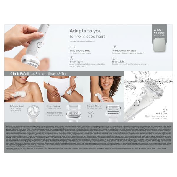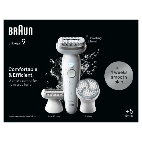 The Braun Silk-�pil 9 ensures up to 1 month of smooth skin, anytime and comfortably. Featuring a wide pivoting head, this Wet & Dry epilator effortlessly follows your contours. This cordless Braun epilator is equipped with 40 MicroGrip tweezers, capable of capturing hairs as short as 0.5mm, ensuring long-lasting smooth skin. Enjoy salon-smooth skin with ultimate control thanks to the comfortable precision handle. Say goodbye to the inconvenience of waiting for hair to regrow, as required by other hair removal products such as wax. This epilator is designed for convenience and eliminates the need for clean-ups or appointments. Tip: for reduced pain sensation, epilate in the bath or shower under warm water. Built to last years: our epilators are made in Germany.