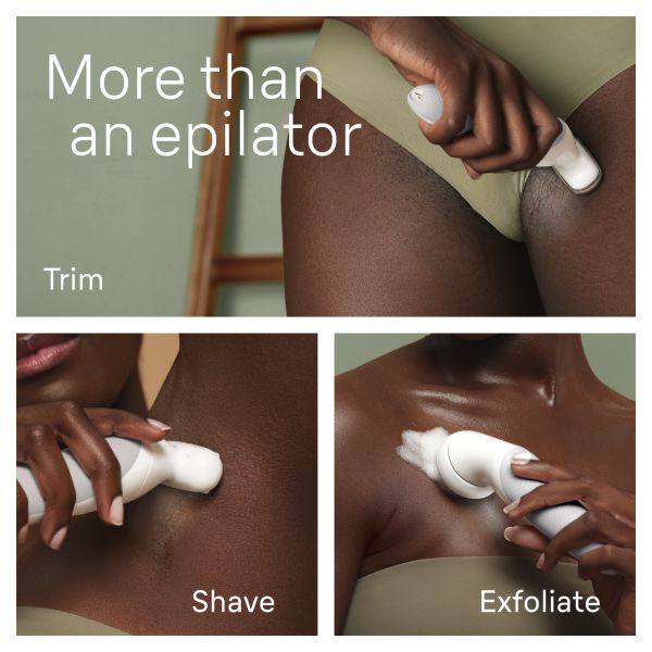 • More than an epilator: includes exfoliation brush, lady shaver head and trimmer comb for sensitive areas.