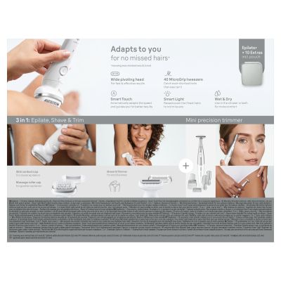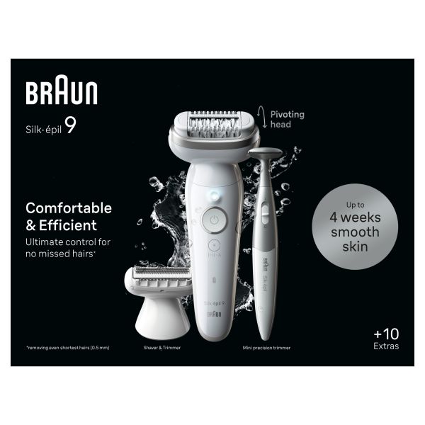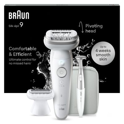 The Braun Silk-�pil 9 ensures up to 1 month of smooth skin, anytime and comfortably. Featuring a wide pivoting head, this Wet & Dry epilator effortlessly follows your contours. This cordless Braun epilator is equipped with 40 MicroGrip tweezers, capable of capturing hairs as short as 0.5mm, ensuring long-lasting smooth skin. Enjoy salon-smooth skin with ultimate control thanks to the comfortable precision handle. Say goodbye to the inconvenience of waiting for hair to regrow, as required by other hair removal products such as wax. This epilator is designed for convenience and eliminates the need for clean-ups or appointments. Tip: for reduced pain sensation, epilate in the bath or shower under warm water. Built to last years: our epilators are made in Germany.