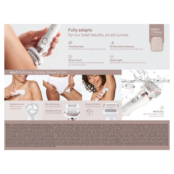 • More than an epilator: includes exfoliation brush, lady shaver head and trimmer comb for sensitive areas.