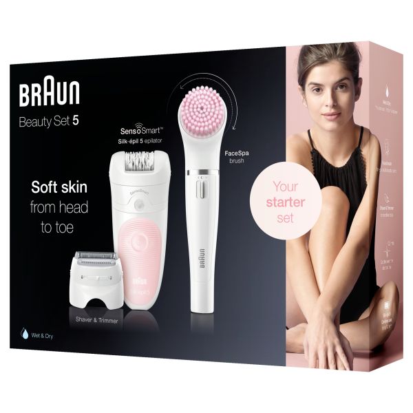 Introducing the Braun Beauty Set 5, the starter 4-in-1 hair removal set for face and body. Epilate, shave, trim, cleanse. Epilator removes 4x shorter hair than wax for up to 4 weeks of smooth skin. SensoSmart technology ensures optimal pressure for best results. Includes shaver & trimmer attachment for hair removal in sensitive areas. The extra sensitive facial brush gently cleanses your skin. Cordless use up to 30 mins. 100% wet and dry. Use in the bath or shower to reduce discomfort. Epilation is virtually painless with regular use.